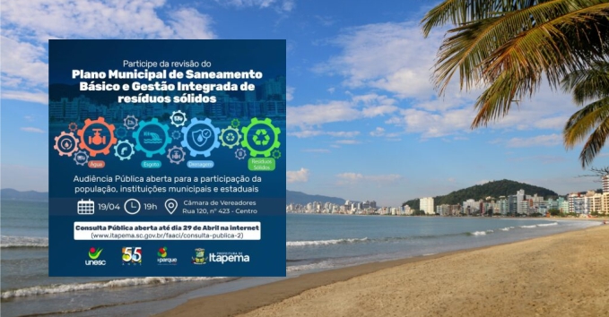 A Revisão do Plano Municipal de Saneamento Básico e Gestão Integrada de Resíduos Sólidos de Itapema está em sua fase final. Nesta fase a população pode participar de uma Consulta Pública aberta até dia 29 de Abril pela internet (www.itapema.sc.gov.br/faaci/consulta-publica-2) e também da audiência pública  que será realizada no dia 19 de abril na Câmara de Vereadores de Itapema (Rua 120, nº 423 – Bairro Centro), a partir das 19h.