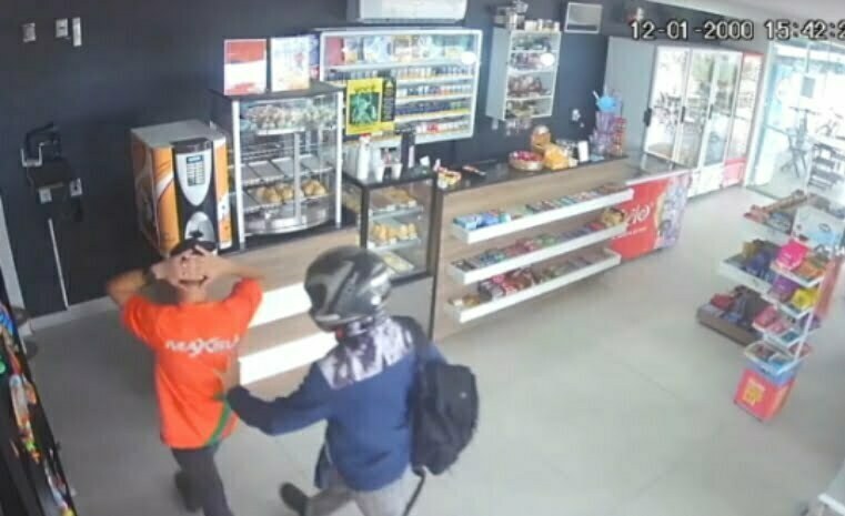 Armados com um revólver eles levaram R$3.225,00 e 21 maços de cigarro que foram colocados em uma mochila de cor preta.