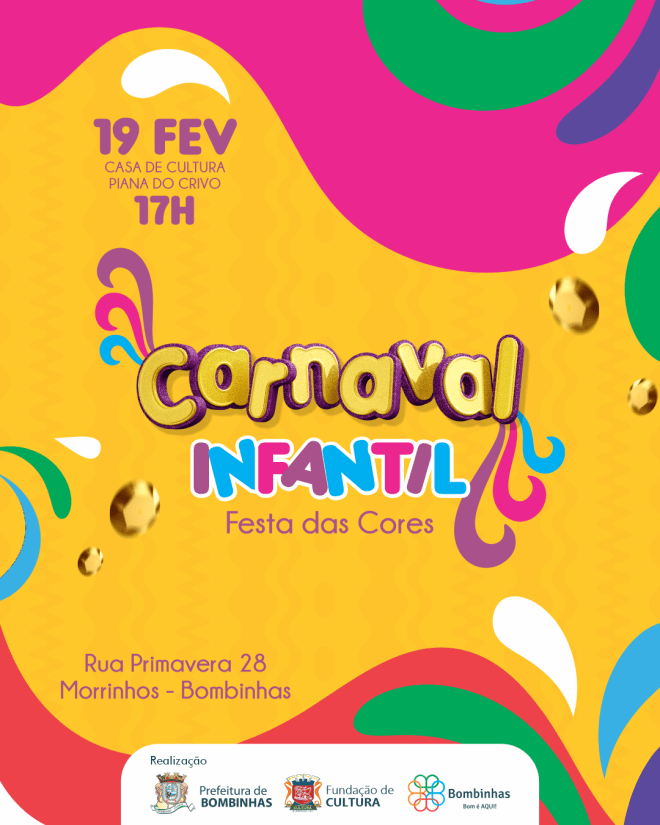 Acontece no domingo 19 de fevereiro, o tradicional Baile de Carnaval Infantil este ano com o tema “Festa das Cores”, na Casa de Cultura Piana do Crivo, no bairro Morrinhos, das 17 às 20 horas.