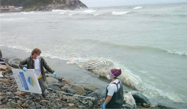 De acordo com a equipe, o encalhe é complexo e, por causa das questões de segurança e estrutura, a baleia-jubarte será enterrada na manhã deste domingo (11).