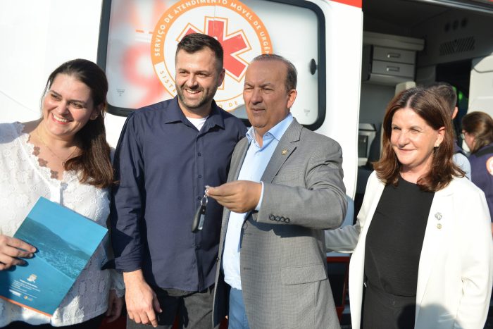 Em cerimônia oficial realizada nesta segunda-feira (24), o vice-prefeito Alexandre da Silva recebeu do governador Jorginho Mello e da secretária de Estado da Saúde, Carmen Zanotto, as chaves da nova ambulância ao Serviço de Atendimento Móvel de Urgência (SAMU).
