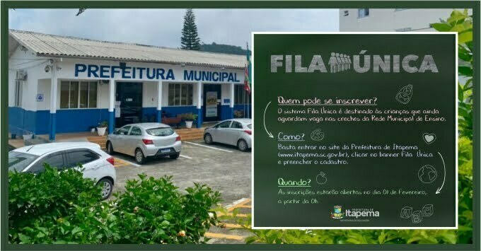 A Secretaria de Educação informa que a abertura do cadastro do Fila Única será às 00h (meia noite) do dia 31 para o dia 01 de fevereiro. Os pais deverão entrar no site da Prefeitura de Itapema (www.itapema.sc.gov.br) e clicar no banner “Fila Única”.