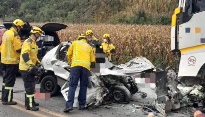 As vítimas ficaram presas no interior do veículo e precisaram ser retiradas pelos bombeiros durante o trabalho de resgate.
