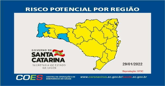 Houve piora nos indicadores das regiões Médio Vale do Itajaí e Xanxerê, que na semana anterior estavam classificadas no nível moderado (azul) e passaram a ser classificados no nível alto (amarelo), juntando-se as regiões do Alto Vale do Itajaí, Alto Vale do Rio do Peixe, Carbonífera, Extremo Sul Catarinense, Foz do Rio Itajaí, Grande Florianópolis, Laguna, Meio Oeste, Nordeste, Oeste, Planalto Norte, Serra Catarinense e Vale do Itapocu que se mantiveram no nível alto (amarelo).