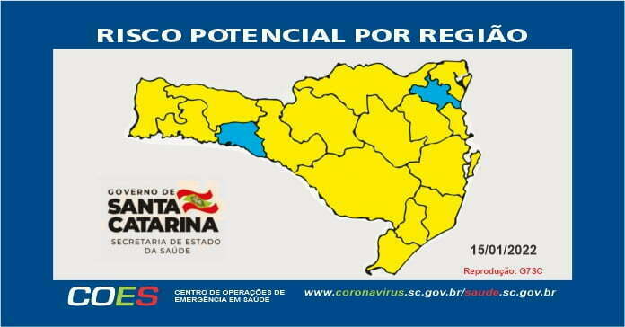 A Matriz de Risco Potencial Regionalizado divulgada neste sábado, 15, aponta 15 regiões classificadas como risco potencial alto (cor amarelo) e duas no nível moderado (cor azul). Em um comparativo com o relatório divulgado na semana anterior, as regiões do Vale do Itapocu e Alto Uruguai Catarinense se mantiveram no nível moderado e as regiões Grande Florianópolis e Carbonífera se mantiveram no alto. No entanto, houve piora nos indicadores das demais.