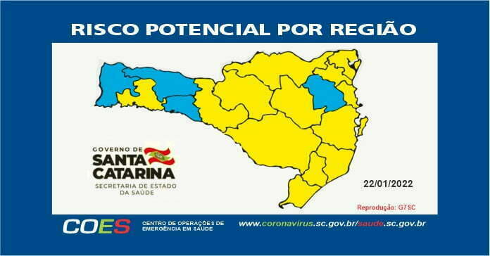 A Matriz de Risco Potencial Regionalizado divulgada neste sábado, 22, aponta 13 regiões classificadas como risco potencial alto (cor amarelo) e quatro no nível de risco moderado (cor azul). Em um comparativo com o relatório divulgado na semana anterior, as regiões do Extremo Oeste, Médio Vale do Itajaí e Xanxerê, que estavam classificadas no nível alto (amarelo), tiveram melhora nos indicadores e passaram a ser classificados no nível moderado (azul), juntando-se ao Alto Uruguai Catarinense. Já o Vale do Itapocú, que estava no nível moderado (azul), teve piora na dimensão transmissibilidade, se juntando às regiões do Alto Vale do Itajaí, Alto Vale do Rio do Peixe, Carbonífera, Extremo Sul Catarinense, Foz do Rio Itajaí, Grande Florianópolis, Laguna, Meio Oeste, Nordeste, Oeste, Planalto Norte e Serra Catarinense que se mantiveram no nível alto (amarelo).