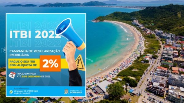 A Prefeitura de Bombinhas, por meio da Secretaria de Finanças, informa que o contribuinte pode pagar o Imposto sobre a Transmissão de Bens Imóveis (ITBI) em pagamento único e com desconto até o dia 31 de dezembro de 2022. A alíquota foi reduzida de 3% para 2% para a regularização de débitos tributários municipais.