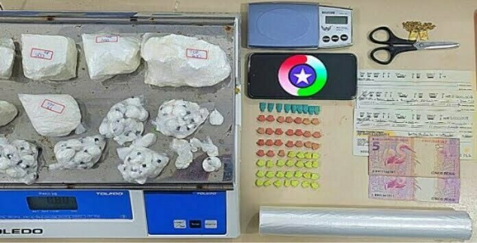 Foram apreendidas nessa residência, drogas no armário, as quais estavam em uma mochila que continha uma balança de precisão e três cheques, sendo um deles em branco, apenas assinado, no valor de R$ 2.200 e outro de R3 3 mil. Ao contabilizar a quantidade de cocaína, deu 800 gramas. Elas estavam separadas em porções de diferentes pesos e muitas delas já embaladas separadamente para a venda em buchas.