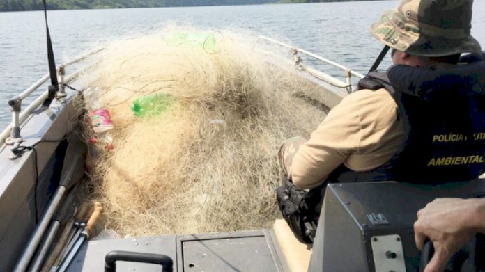 Neste final de semana, 19 e 20 de fevereiro, policiais da Polícia Militar Ambiental (PMA) em Chapecó, durante patrulhamento aquático no lago da usina hidrelétrica Foz do Chapecó, apreendeu o total de nove redes de pesca, de diversos tipos de malha, incluindo malhas proibidas, totalizando aproximadamente 6.500 metros quadrados de material.