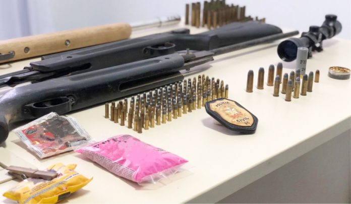 As buscas nas residências dos suspeitos resultaram na apreensão de venenos, de uma arma de fogo artesanal calibre 12 gauge, de carabinas possivelmente modificadas para calibre .22 LR, de munições diversas e de uma luneta possivelmente de uso restrito.