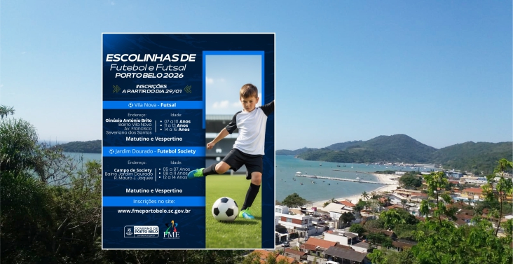 A Fundação Municipal de Esportes (FME), em parceria com o Governo de Porto Belo, abre a partir desta quinta-feira, 29 de janeiro, as inscrições para as Escolinhas de Futebol e Futsal – Porto Belo 2026. A iniciativa busca ampliar o acesso ao esporte de base, promovendo saúde, disciplina, inclusão social e desenvolvimento humano entre crianças e adolescentes do município.