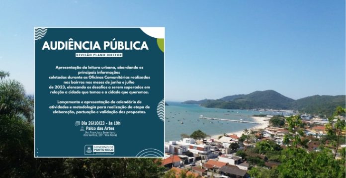 O Governo de Porto Belo convida toda a comunidade a participar de uma audiência pública, no dia 26 de outubro às 19h no Palco Das Artes. Na oportunidade será feita apresentação do conteúdos levantado durante as oficinas realizadas anteriormente nos bairros.