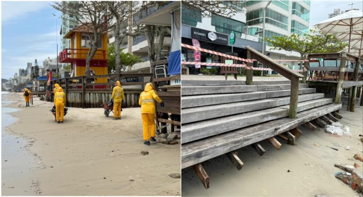 Técnicos percorrem a faixa de areia e o calçadão da Meia Praia, identificando trechos afetados e colocando sinalização de risco. As equipes de Obras recolhem entulhos, reparando pontos danificados, enquanto a limpeza urbana retira detritos e areia acumulada. Aos permissionários de quiosques atingidos foi recomendado que removam seus bens até que as áreas sejam liberadas.