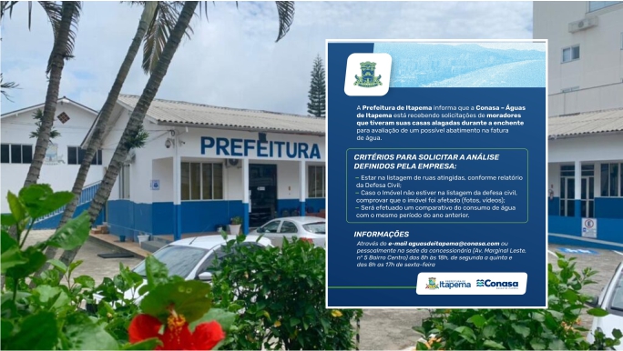A Prefeitura de Itapema, em parceria com a Conasa – Águas de Itapema, está oferecendo abatimento nas faturas de água para famílias que tiveram suas residências alagadas durante as recentes enchentes. O objetivo é minimizar o impacto financeiro causado pelo aumento no consumo de água necessário para limpeza e reparos.