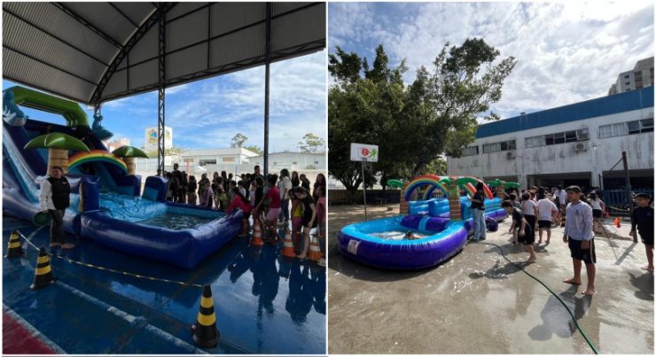 A Escola Cívico-Militar Maria Linhares de Souza viveu um dia de pura diversão nesta quarta-feira (8), durante a programação da Semana da Criança. O pátio da unidade se transformou em um grande espaço de lazer com escorregadores aquáticos, pula-pulas e jogos que encantaram os alunos.