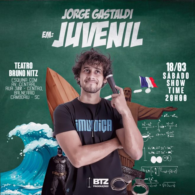 O comediante itajaiense Jorge Gastaldi apresenta o espetáculo “Juvenil” no Teatro Municipal Bruno Nitz neste sábado (18), às 20h.