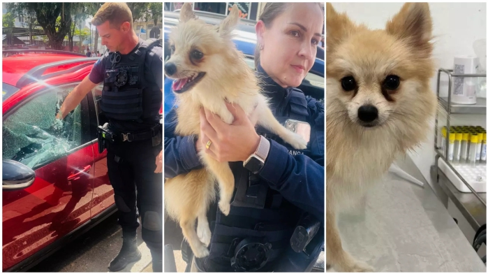 Os agentes tentaram chamar o cão, que não respondia. Diante da urgência, quebraram um dos vidros do veículo para resgatá-lo. Uma guarda municipal prestou os primeiros socorros, oferecendo água ao animal.