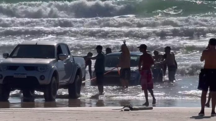 Uma caminhonete ficou atolada e parcialmente submersa na Praia do Mariscal, em Bombinhas, nesta sexta-feira (27). O incidente foi registrado pelo surfista David Cunha, que divulgou vídeos mostrando o esforço de um grupo para retirar o veículo da areia com a ajuda de outra caminhonete e um cabo de reboque.