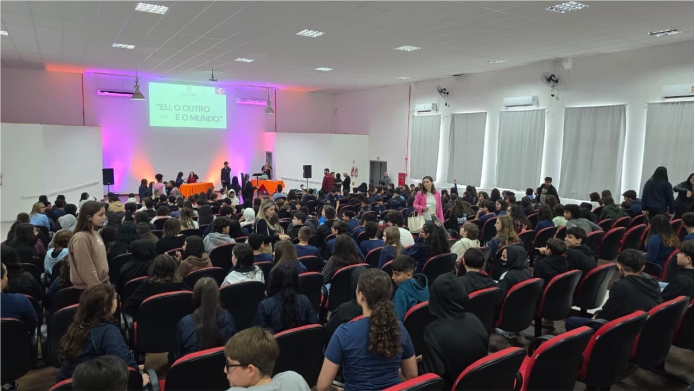 A Escola Básica Municipal Maria Benta da Silva Cabral promoveu, nesta terça-feira (07), a vivência “Eu, o Outro e o Mundo”, conduzida por Fernanda Teixeira dos Santos. A proposta reuniu alunos do 6º ao 9º ano no Palco das Artes, em momentos de escuta, reflexão e convivência.